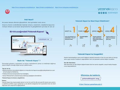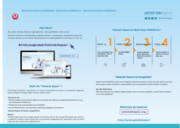 Kariyer Kapısına e-devlet ile giriş yapılmakta, öğrenci bilgilerinizin kariyer kapısı platformuna aktarılması için , yetenek kapısı platformuna kayıt yapılması gerekmektedir.Üyelik için tıklayınız